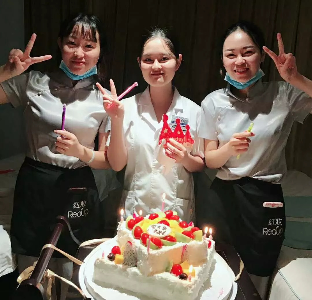 △经过一年的相处,尹莲已经完全融入了红妆美业昌茂分院大家庭